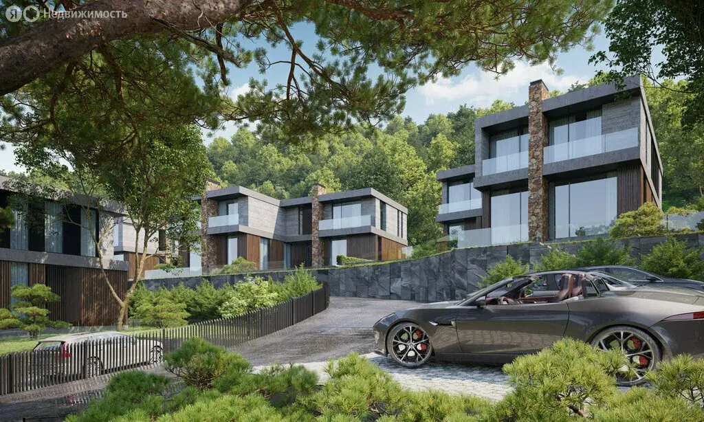 Собственная зона отдыха с террасой, бассейнами (с подогревом), парковка на два авто, панорамные виды на лес и горы. Участки благоустроены — газон, дорожки, дренаж, освещение.